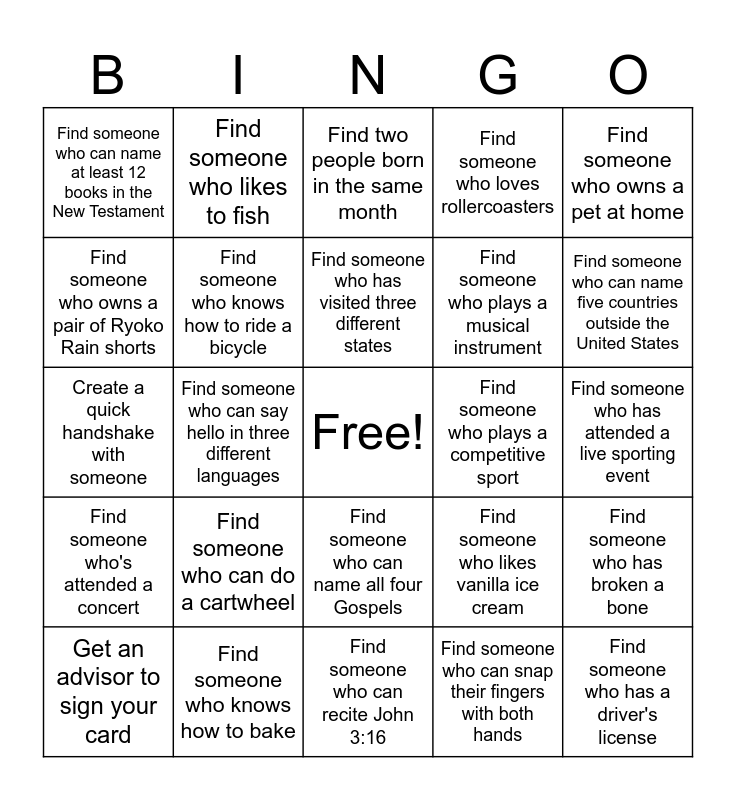 This bingo card has a free space and 24 words: Find someone who can do a cartwheel, Find someone who knows how to bake, Find someone who has visited three different states, Get an advisor to sign your card, Find someone who owns a pet at home, Find someone who can name at least 12 books in the New Testament, Find someone who owns a pair of Ryoko Rain shorts, Find someone who likes to fish, Find someone who plays a competitive sport, Find someone who can name all four Gospels, Find someone who plays a musical instrument, Create a quick handshake with someone, Find someone who likes vanilla ice cream, Find someone who has broken a bone, Find someone who knows how to ride a bicycle, Find someone who can snap their fingers with both hands, Find someone who has attended a live sporting event, Find two people born in the same month, Find someone who can name five countries outside the United States, Find someone who can say hello in three different languages, Find someone who has a driver's license, Find someone who's attended a concert, Find someone who loves rollercoasters and Find someone who can recite John 3:16.