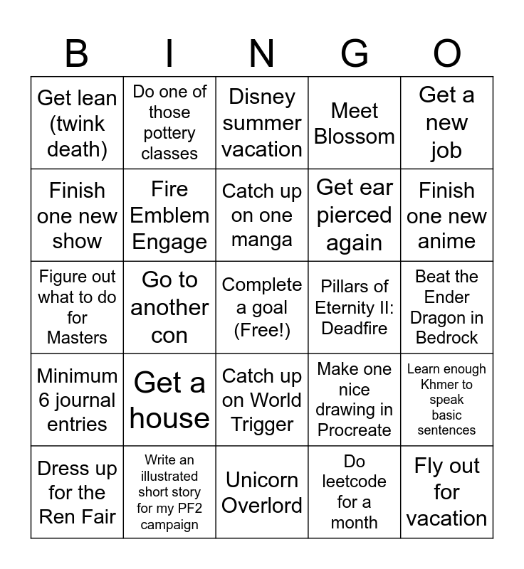 This bingo card has a free space and 24 words: Get a house, Write an illustrated short story for my PF2 campaign, Catch up on one manga, Dress up for the Ren Fair, Get a new job, Get lean (twink death), Finish one new show, Do one of those pottery classes, Pillars of Eternity II: Deadfire, Catch up on World Trigger, Get ear pierced again, Figure out what to do for Masters, Make one nice drawing in Procreate, Learn enough Khmer to speak basic sentences, Fire Emblem Engage, Do leetcode for a month, Beat the Ender Dragon in Bedrock, Disney summer vacation, Finish one new anime, Go to another con, Fly out for vacation, Minimum 6 journal entries, Meet Blossom and Unicorn Overlord.