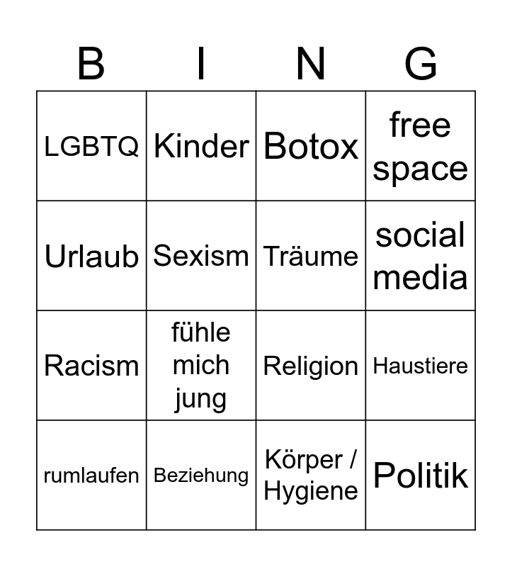 This bingo card has 16 words: Beziehung, Haustiere, Botox, LGBTQ, Racism, Kinder, Religion, Körper / Hygiene, Urlaub, Sexism, rumlaufen, free space, fühle mich jung, social media, Träume and Politik.
