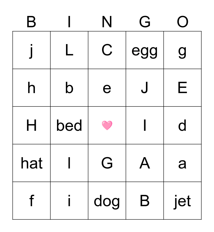 This bingo card has a free space and 24 words: l, i, e, f, g, j, h, L, I, G, J, H, A, a, b, B, d, C, E, bed, jet, hat, egg and dog.