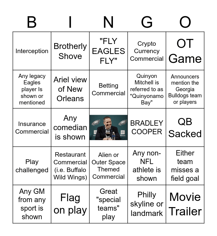 This bingo card has a free space and 24 words: Any GM from any sport is shown, Restaurant Commercial (i.e. Buffalo Wild Wings), Betting Commercial, Philly skyline or landmark, ОТ Game, Interception, Brotherly Shove, "FLY EAGLES FLY", BRADLEY COOPER, QB Sacked, Insurance Commercial, Ariel view of New Orleans, Any non- NFL athlete is shown, Either team misses a field goal, Any legacy Eagles player Is shown or mentioned, Flag on play, Great "special teams" play, Crypto Currency Commercial, Announcers mention the Georgia Bulldogs team or players, Play challenged, Any comedian is shown, Alien or Outer Space Themed Commercial, Quinyon Mitchell is referred to as *Quinyonamo Bay" and Movie Trailer.