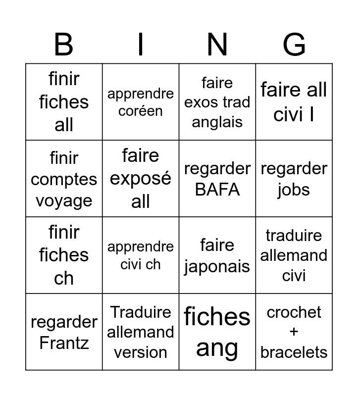This bingo card has 16 words: Traduire allemand version, traduire allemand civi, faire exos trad anglais, finir fiches all, finir fiches ch, apprendre coréen, faire japonais, fiches ang, finir comptes voyage, faire exposé all, regarder Frantz, faire all civi I, apprendre civi ch, regarder jobs, regarder BAFA and crochet + bracelets.