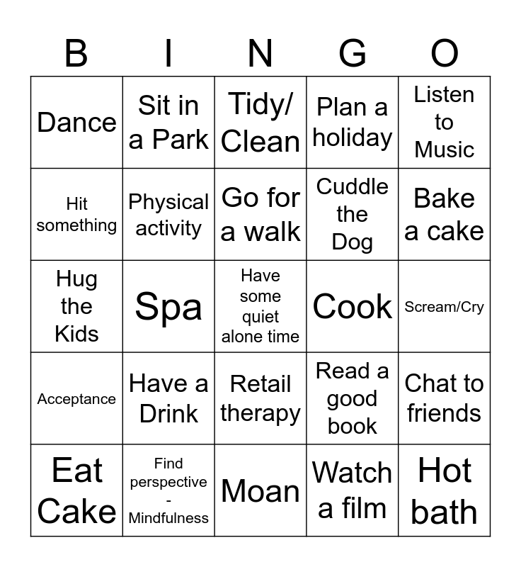 This bingo card has 25 words: Have a Drink, Moan, Go for a walk, Eat Cake, Listen to Music, Dance, Hit something, Sit in a Park, Cook, Retail therapy, Cuddle the Dog, Hug the Kids, Read a good book, Chat to friends, Physical activity, Hot bath, Scream/Cry, Tidy/ Clean, Bake a cake, Spa, Have some quiet alone time, Find perspective - Mindfulness, Acceptance, Plan a holiday and Watch a film.