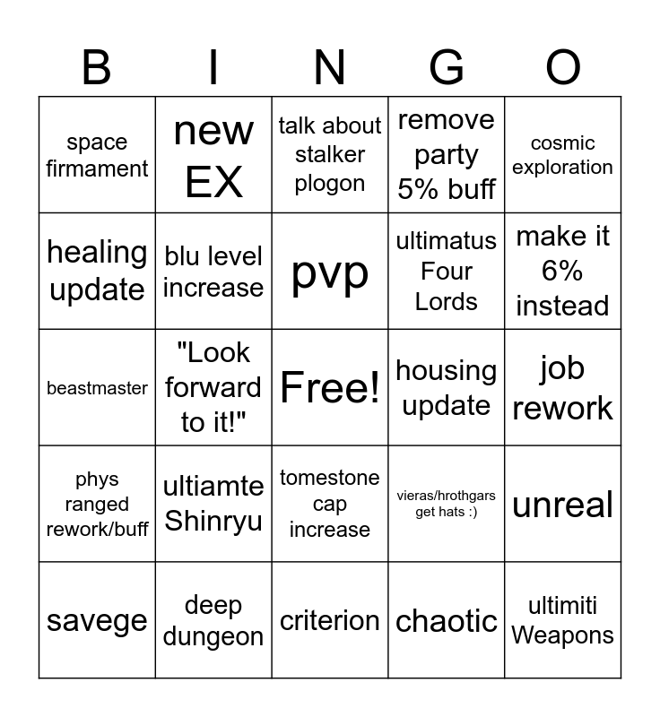 This bingo card has a free space and 24 words: savege, ultiamte Shinryu, pvp, chaotic, cosmic exploration, space firmament, new EX, talk about stalker plogon, housing update, job rework, beastmaster, blu level increase, vieras/hrothgars get hats :), unreal, healing update, deep dungeon, criterion, remove party 5% buff, make it 6% instead, phys ranged rework/buff, "Look forward to it!", tomestone cap increase, ultimatus Four Lords and ultimiti Weapons.