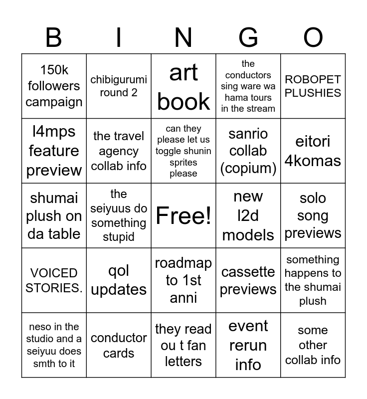 This bingo card has a free space and 24 words: qol updates, conductor cards, can they please let us toggle shunin sprites please, neso in the studio and a seiyuu does smth to it, ROBOPET PLUSHIES, 150k followers campaign, l4mps feature preview, chibigurumi round 2, new l2d models, roadmap to 1st anni, sanrio collab (copium), shumai plush on da table, cassette previews, something happens to the shumai plush, the travel agency collab info, event rerun info, solo song previews, art book, eitori 4komas, the seiyuus do something stupid, some other collab info, VOICED STORIES., the conductors sing ware wa hama tours in the stream and they read ou t fan letters.