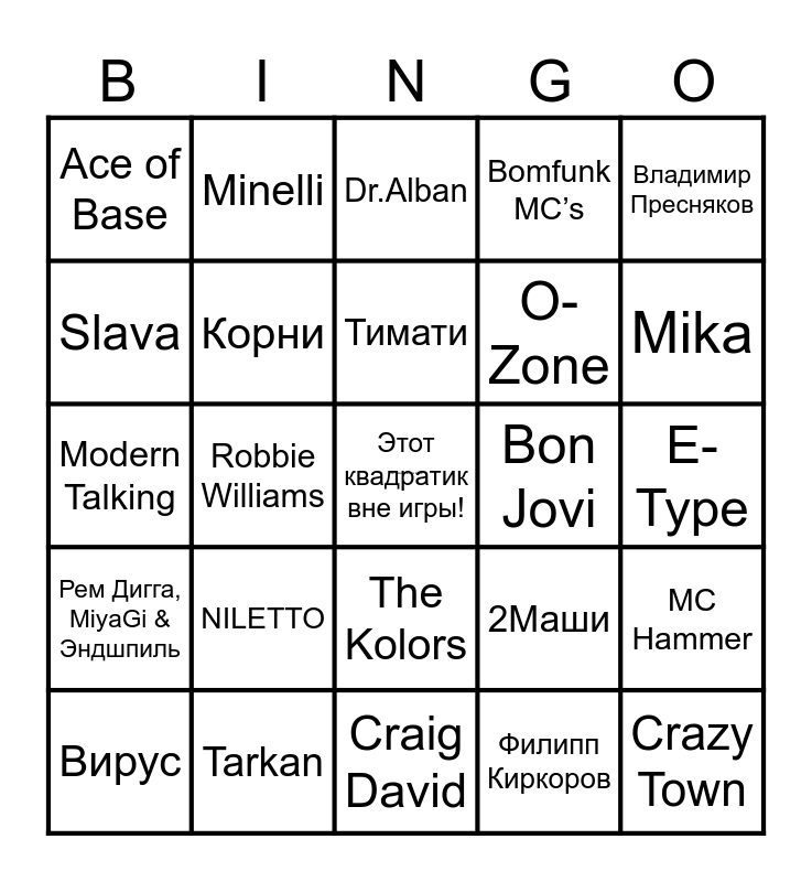 This bingo card has a free space and 24 words: NILETTO, Tarkan, Тимати, Вирус, Владимир Пресняков, Ace of Base, Slava, Minelli, Bon Jovi, The Kolors, O-Zone, Modern Talking, 2Маши, MC Hammer, Корни, Филипп Киркоров, E-Type, Dr.Alban, Mika, Robbie Williams, Crazy Town, Рем Дигга, MiyaGi & Эндшпиль, Bomfunk MC’s and Craig David.