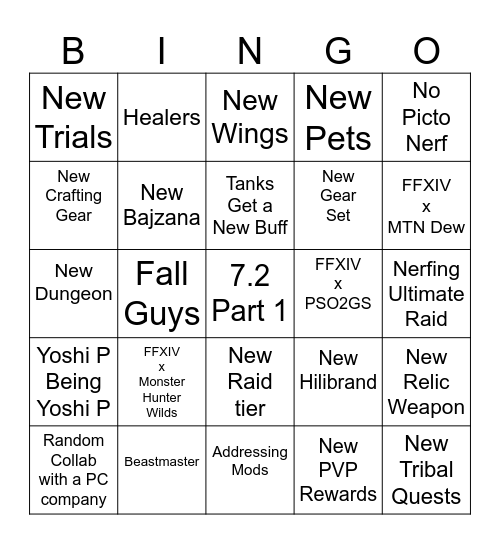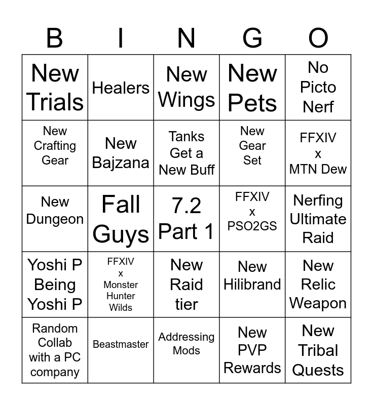 This bingo card has a free space and 24 words: FFXIV x Monster Hunter Wilds, Beastmaster, Tanks Get a New Buff, Random Collab with a PC company, No Picto Nerf, New Trials, New Crafting Gear, Healers, FFXIV x PSO2GS, New Raid tier, New Gear Set, New Dungeon, New Hilibrand, New Relic Weapon, New Bajzana, New PVP Rewards, Nerfing Ultimate Raid, New Wings, FFXIV x MTN Dew, Fall Guys, New Tribal Quests, Yoshi P Being Yoshi P, New Pets and Addressing Mods.
