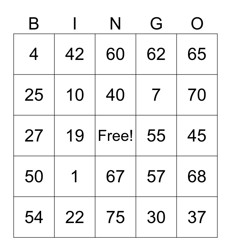 This bingo card has a free space and 24 words: 1, 22, 40, 54, 65, 4, 25, 42, 55, 67, 7, 27, 57, 68, 10, 30, 45, 60, 70, 19, 37, 50, 62 and 75.