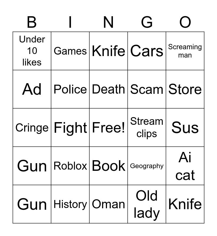 This bingo card has a free space and 24 words: Roblox, History, Death, Gun, Screaming man, Under 10 likes, Ad, Games, Stream clips, Book, Scam, Cringe, Geography, Ai cat, Police, Old lady, Sus, Knife, Store, Fight, Knife, Gun, Cars and Oman.