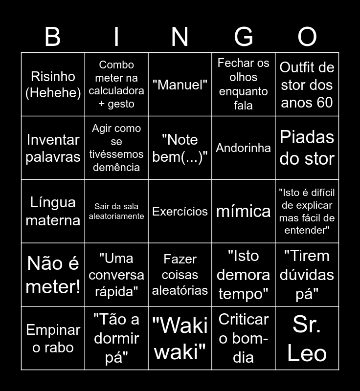 This bingo card has a free space and 27 words: "Isto demora tempo", "Tá certo?", Andorinha, "Waki waki", Inventar palavras, "Manuel", Combo meter na calculadora + gesto, Não é meter!, mímica, "Tirem dúvidas pá", Língua materna, Fechar os olhos enquanto fala, Empinar o rabo, "Tão a dormir pá", Piadas do stor, Mãozinha na boca, Agir como se tivéssemos demência, "Note bem(...)", "Uma conversa rápida", Risinho (Hehehe), "Isto é difícil de explicar mas fácil de entender", Criticar o bom-dia, Sair da sala aleatoriamente, Sr. Leo, Fazer coisas aleatórias, Outfit de stor dos anos 60 and Mãozinha atrás das costas.