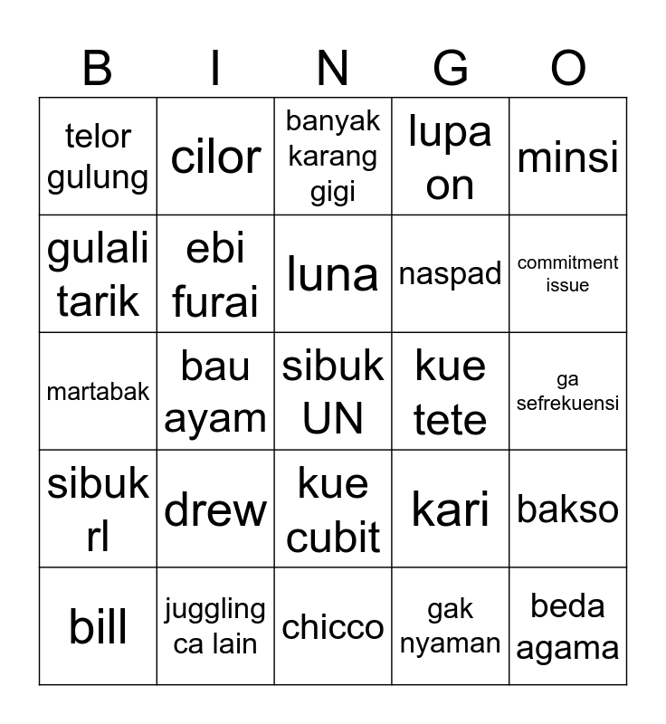 This bingo card has 25 words: drew, chicco, luna, bill, minsi, telor gulung, gulali tarik, cilor, kue tete, kue cubit, naspad, martabak, kari, bakso, ebi furai, beda agama, ga sefrekuensi, banyak karang gigi, commitment issue, bau ayam, sibuk UN, juggling ca lain, sibuk rl, lupa on and gak nyaman.
