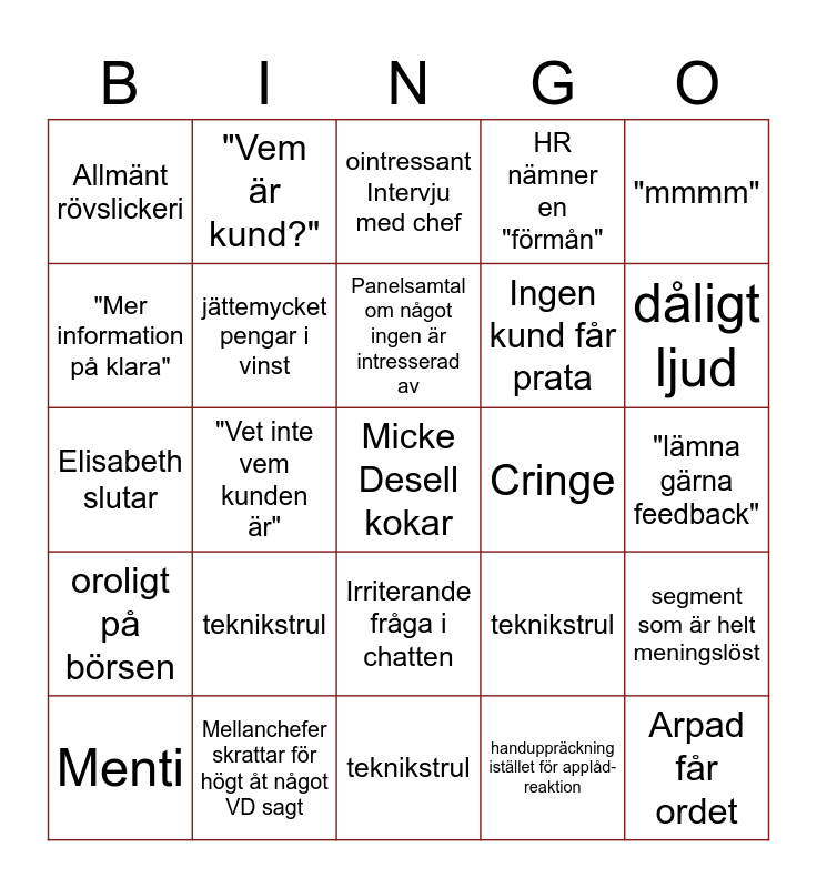 This bingo card has a free space and 24 words: teknikstrul, Mellanchefer skrattar för högt åt något VD sagt, Panelsamtal om något ingen är intresserad av, Menti, "mmmm", Allmänt rövslickeri, "Mer information på klara", "Vem är kund?", Cringe, Irriterande fråga i chatten, Ingen kund får prata, Elisabeth slutar, teknikstrul, segment som är helt meningslöst, jättemycket pengar i vinst, handuppräckning istället för applåd-reaktion, "lämna gärna feedback", ointressant Intervju med chef, dåligt ljud, "Vet inte vem kunden är", Arpad får ordet, oroligt på börsen, HR nämner en "förmån" and teknikstrul.