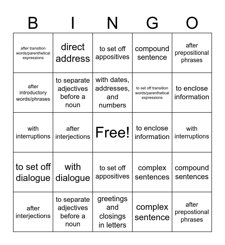 This bingo card has a free space and 25 words: with dialogue, greetings and closings in letters, with dates, addresses, and numbers, after interjections, after prepositional phrases, after transition words/parenthetical expressions, after introductory words/phrases, direct address, to enclose information, to set off appositives, to set off transition words/parenthetical expressions, with interruptions, complex sentences, compound sentences, to separate adjectives before a noun, words, phrases,or clauses in a series, with interruptions, to set off appositives, to enclose information, after interjections, after prepostional phrases, to separate adjectives before a noun, to set off dialogue, compound sentence and complex sentence.
