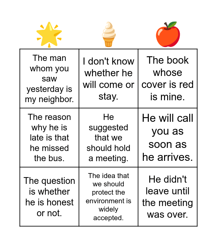 This bingo card has a free space and 8 words: He will call you as soon as he arrives., The book whose cover is red is mine., I don't know whether he will come or stay., The question is whether he is honest or not., The man whom you saw yesterday is my neighbor., He didn't leave until the meeting was over., The reason why he is late is that he missed the bus. and The idea that we should protect the environment is widely accepted..