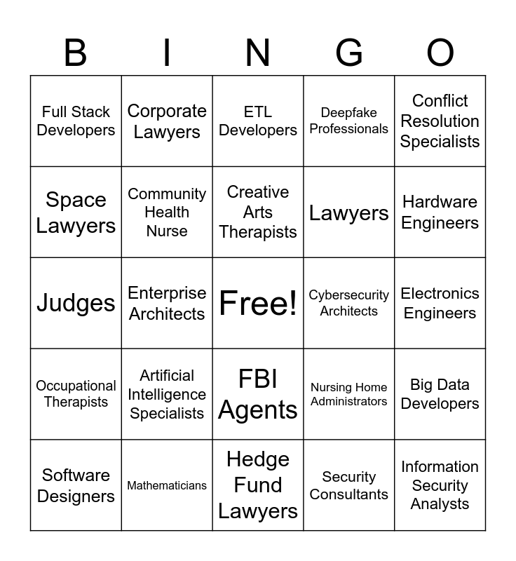 This bingo card has a free space and 36 words: Geriatric Psychiatrists, Tutors and Trainers, Clinic Managers, Community Health Nurse, Nursing Home Administrators, Occupational Therapists, Creative Arts Therapists, Directors of Volunteers, Conflict Resolution Specialists, Chief Information Officers, Enterprise Architects, Deepfake Professionals, Blockchain Developers, Cybersecurity Architects, Hardware Engineers, Full Stack Developers, Cloud Engineers, Artificial Intelligence Specialists, Information Security Analysts, ETL Developers, Electronics Engineers, Big Data Developers, Mathematicians, Software Designers, Hedge Fund Lawyers, Corporate Lawyers, Judges, Family Lawyers, Lawyers, Space Lawyers, Environmental Lawyers, Fire Protection Engineers, Security Consultants, FBI Agents, Body Guards and Polygraph Examiners.