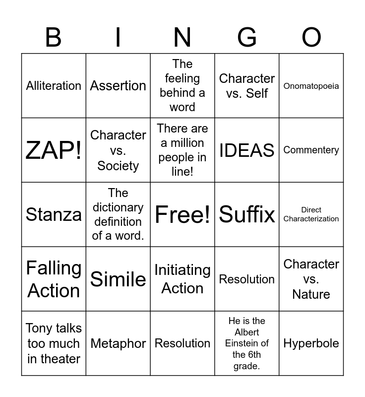 This bingo card has a free space and 24 words: Simile, Metaphor, There are a million people in line!, Tony talks too much in theater, Onomatopoeia, Alliteration, ZAP!, Assertion, Suffix, Initiating Action, IDEAS, Stanza, Resolution, Character vs. Nature, Character vs. Society, He is the Albert Einstein of the 6th grade., Direct Characterization, The feeling behind a word, Commentery, The dictionary definition of a word., Hyperbole, Falling Action, Character vs. Self and Resolution.