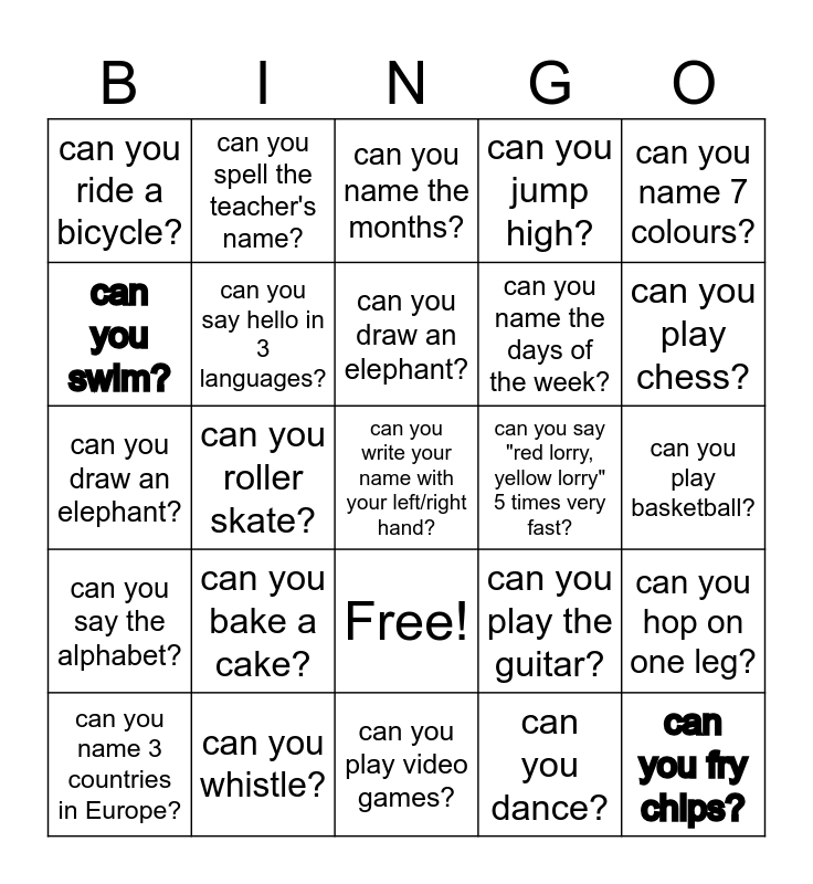 This bingo card has 26 words: Free!, can you dance?, can you draw an elephant?, can you whistle?, can you name 7 colours?, can you ride a bicycle?, can you swim?, can you spell the teacher's name?, can you play basketball?, can you play the guitar?, can you name the days of the week?, can you draw an elephant?, can you hop on one leg?, can you name 3 countries in Europe?, can you roller skate?, can you sing well?, can you jump high?, can you say the alphabet?, can you name the months?, can you write your name with your left/right hand?, can you play chess?, can you play video games?, can you say "red lorry, yellow lorry" 5 times very fast?, can you bake a cake?, can you say hello in 3 languages? and can you fry chips?.