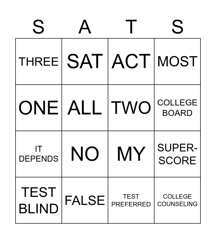 This bingo card has 20 words: SUPER-SCORE, YES, ACT, FRIDAY, TEST BLIND, ONE, FALSE, THREE, IT DEPENDS, SAT, NO, MY, ALL, COLLEGE COUNSELING, TWO, TEST FLEXIBLE, COLLEGE BOARD, MOST, TEST PREFERRED and TRUE.