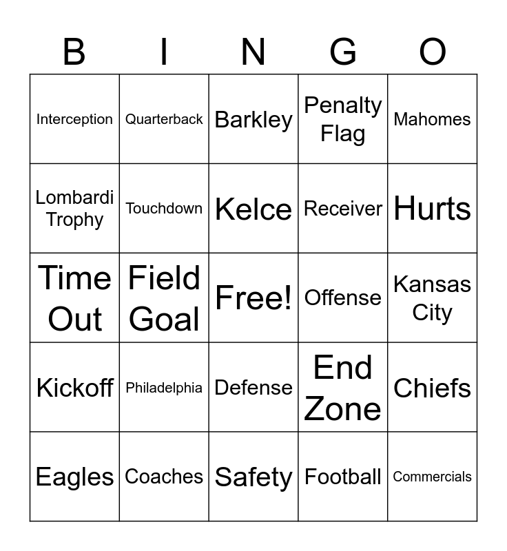 This bingo card has a free space and 24 words: Philadelphia, Coaches, Kelce, Eagles, Mahomes, Interception, Lombardi Trophy, Quarterback, Offense, Defense, Receiver, Time Out, End Zone, Chiefs, Touchdown, Football, Kansas City, Barkley, Hurts, Field Goal, Commercials, Kickoff, Penalty Flag and Safety.