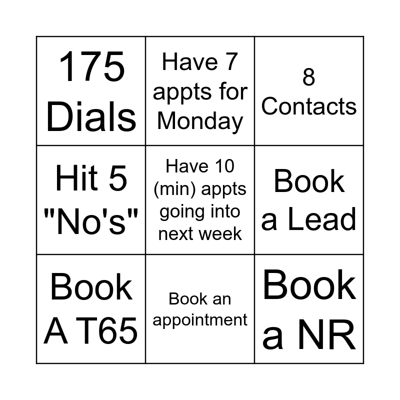 This bingo card has 9 words: Book A T65, 8 Contacts, Have 7 appts for Monday, Hit 5 "No's", 175 Dials, Book a Lead, Have 10 (min) appts going into next week, Book a NR and Book an appointment.