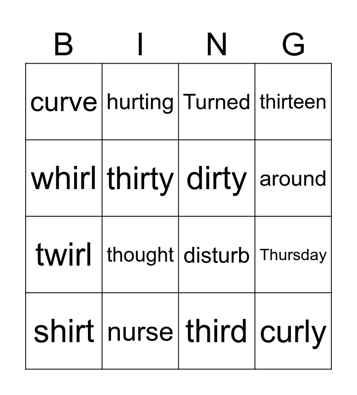 This bingo card has 16 words: nurse, Thursday, Turned, curve, twirl, hurting, disturb, third, whirl, thirty, shirt, thirteen, thought, around, dirty and curly.