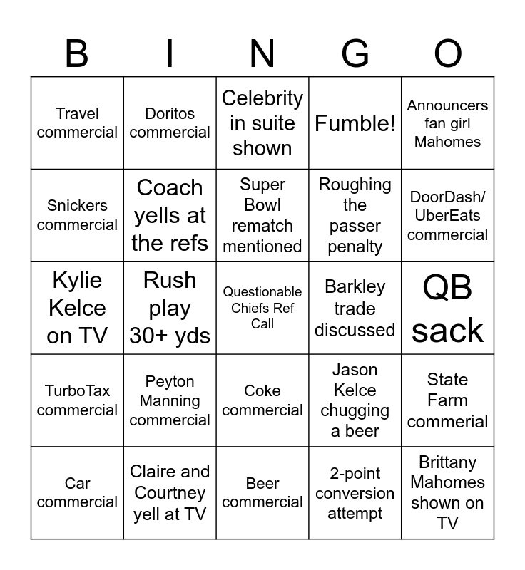 This bingo card has 46 words: Tush Push, Questionable Chiefs Ref Call, Taylor Swift shown on TV, Beer commercial, Peyton Manning commercial, Post Malone in a commercial, Doritos commercial, GoDaddy commercial, Snickers commercial, Pepsi commercial, Coach yells at the refs, Fumble!, State Farm commerial, Jason Kelce chugging a beer, 3-peat mentioned, Andy Reid throwback, Super Bowl rematch mentioned, Barkley trade discussed, Interception, Announcers fan girl Mahomes, Rush play 30+ yds, 2-point conversion attempt, Travel commercial, Roughing the passer penalty, FanDuel commercial, DoorDash/ UberEats commercial, Car commercial, Patrick Mahomes commercial, Coke commercial, TurboTax commercial, End zone celebration, Facemask penalty, Guest performer half time show, Philly Special mentioned, Controversial call made, Claire and Courtney yell at TV, QB sack, Movie trailer commercial, Fast food commercial, Streaming service commercial, Brittany Mahomes shown on TV, Celebrity in suite shown, Kylie Kelce on TV, Missed FG/Extra Point, Shane Gillis commercial and "Inner Excellence" mentioned.