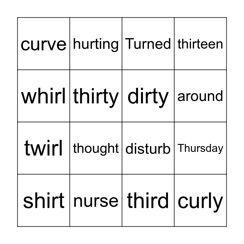 This bingo card has 16 words: nurse, Thursday, Turned, curve, twirl, hurting, disturb, third, whirl, thirty, shirt, thirteen, thought, around, dirty and curly.