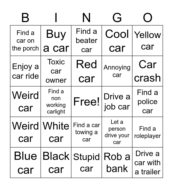This bingo card has a free space and 24 words: White car, Black car, Red car, Blue car, Yellow car, Find a car on the porch, Enjoy a car ride, Buy a car, Drive a job car, Find a car towing a car, Annoying car, Weird car, Let a person drive your car, Find a roleplayer, Toxic car owner, Rob a bank, Find a police car, Find a beater car, Car crash, Find a non working carlight, Drive a car with a trailer, Weird car, Cool car and Stupid car.