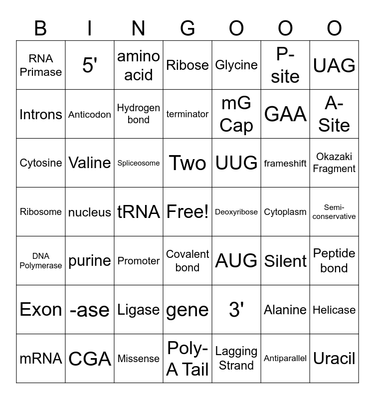 This bingo card has a free space and 55 words: Lagging Strand, Okazaki Fragment, Leading Strand, RNA Primase, nucleus, -ase, UAG, Codon, Anticodon, Ligase, Ribose, Peptide bond, Semi-conservative, Cytoplasm, mRNA, DNA Polymerase, Glycine, mG Cap, Antiparallel, GAA, A-Site, purine, UUG, amino acid, RNA Polymerase, Introns, tRNA, pyrimidine, Cytosine, frameshift, rRNA, Silent, Helicase, CGA, P-site, terminator, Exon, Valine, Uracil, Promoter, 5', gene, 3', nonsense, Spliceosome, Ribosome, Missense, AUG, Deoxyribose, Hydrogen bond, Covalent bond, Alanine, Poly-A Tail, Two and Three.