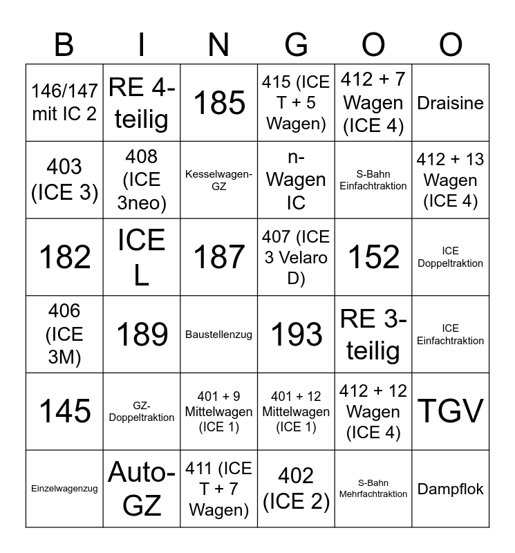 This bingo card has 36 words: 401 + 12 Mittelwagen (ICE 1), 401 + 9 Mittelwagen (ICE 1), 402 (ICE 2), 403 (ICE 3), 406 (ICE 3M), 407 (ICE 3 Velaro D), 408 (ICE 3neo), 411 (ICE T + 7 Wagen), 412 + 7 Wagen (ICE 4), 412 + 12 Wagen (ICE 4), 412 + 13 Wagen (ICE 4), 415 (ICE T + 5 Wagen), TGV, ICE L, n-Wagen IC, 146/147 mit IC 2, 145, 152, 182, 185, 187, 189, 193, Baustellenzug, RE 3-teilig, RE 4-teilig, S-Bahn Einfachtraktion, Auto-GZ, Kesselwagen-GZ, Draisine, Dampflok, Einzelwagenzug, ICE Einfachtraktion, ICE Doppeltraktion, GZ-Doppeltraktion and S-Bahn Mehrfachtraktion.