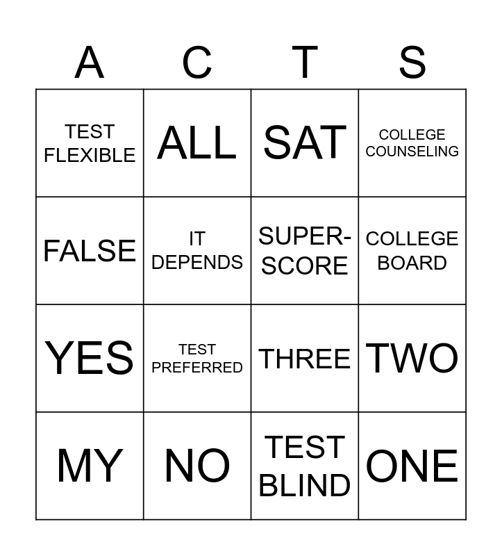 This bingo card has 20 words: TWO, TRUE, SAT, MOST, MY, FALSE, NO, TEST FLEXIBLE, YES, ALL, TEST PREFERRED, THREE, IT DEPENDS, ONE, SUPER-SCORE, FRIDAY, COLLEGE BOARD, COLLEGE COUNSELING, TEST BLIND and ACT.