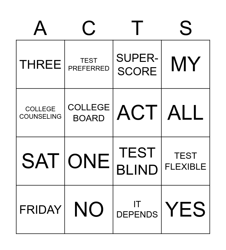 This bingo card has 20 words: TEST FLEXIBLE, MOST, SUPER-SCORE, FALSE, FRIDAY, COLLEGE COUNSELING, NO, THREE, SAT, TEST PREFERRED, ONE, TEST BLIND, COLLEGE BOARD, YES, ACT, TWO, ALL, MY, IT DEPENDS and TRUE.