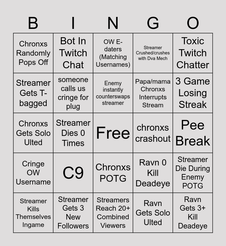 This bingo card has a free space and 34 words: 3 Game Win Streak, Ravn Gets Solo Ulted, Someone Subscribes, Chronxs Gets Widow Diffed (More Than Once), Cringe OW Username, someone calls us cringe for plug, Toxic Twitch Chatter, Streamer Kills Themselves Ingame, Bot In Twitch Chat, Ravn Curses In Danish, Enemy instantly counterswaps streamer, OW E-daters (Matching Usernames), Someone In OW Chat Blames Everybody Else, Ravn POTG, chronxs crashout, 3 Game Losing Streak, Streamer Gets 3 New Followers, Chronxs Gets Solo Ulted, C9, Ravn 0 Kill Deadeye, Chronxs POTG, Someone Donates 100+ Bits, Chronxs Randomly Pops Off, Pee Break, Streamers Reach 20+ Combined Viewers, Ravn Gets 3+ Kill Deadeye, Streamer Crushed/crushes with Dva Mech, Someone From Game Joins Chat, Papa/mama Chronxs Interrupts Stream, Streamer Gets T-bagged, 0 kill ult (support ults not counted), Streamer Dies 0 Times, Streamer Die During Enemy POTG and Streamer Cancels Someones Ult.