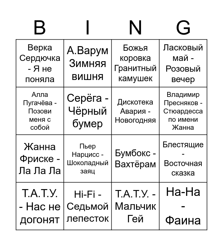 This bingo card has 100 words: Руки вверх - 18 мне уже, Песня из м/ф "Чебурашка" - Голубой вагон, Т.А.Т.У. - Мальчик Гей, Иванушки International - Реви, Мумий Тролль - Утекай, Total - Бьёт по глазам, Вирус - Ты меня не ищи, Бумбокс - Хоттабыч, Гости из Будущего - Беги от меня, Непара - Плачь и смотри, Краски - Он не знает ничего, Иванушки International - Тополиный пух, Тутси - Самый самый, Максим - Трудный возраст, Максим - Знаешь ли ты, Quest Pistols - Белая стрекоза любви, Жанна Фриске - Ла Ла Ла, Дима Билан - Невозможное возможно, Отпетые мошенники - А у реки, Demo - Солнышко, Би-2 - Полковнику никто не пишет, Натали - Ветер с моря дул, Валерия - Часики, Верка Сердючка - Хорошо, Фристайл - Ах, какая женщина, Hi-Fi - Седьмой лепесток, Алла Пугачёва - Позови меня с собой, Иракли - Лондон-Париж, Корни - Ты узнаешь её, ВИА Гра - Попытка номер 5, Блестящие - Восточная сказка, Верка Сердючка - Я не поняла, Руки вверх Студент, Слава - Одиночество сука, Игорь Николаев - Выпьем за любовь, Владимир Пресняков - Стюардесса по имени Жанна, Филипп Киркоров - Просто подари, Банд'Эрос - Коламбия пикчерз не представляет, Катя Лель - Мой мармеладный, Н.Королева Желтые тюльпаны, Андрей Губин - Девушки как звёзды, Комбинация - American Boy, Бумбокс - Вахтёрам, Ёлка - Прованс, Пьер Нарцисс - Шоколадный заяц, Божья коровка Гранитный камушек, Т.А.Т.У. - Я сошла с ума, Валерий Меладзе - Салют, Вера!, Ленинград Лабутены, Дима Билан - На берегу неба, Galibri & Mavik Феллини, Градусы - Голая, Кот Леопольд Дождик босиком, Трубач Голубая Луна, Андрей Губин - Зима холода, Кар-мен Лондон гудбай, Песня из м/ф Чебурашка - Пусть бегут неуклюже, Ласковый май - Белые розы, Алла Пугачёва - Этот мир, Ласковый май - Розовый вечер, Мираж - Музыка нас связала, NILETTO & Rauf & Faik - Если тебе будет грустно, NILETTO - Любимка, И.Салтыкова Серые глаза, И.Николаев Такси, Мурат Насыров - Я это ты, ты это я, ANNA ASTI - Царица, Михаил Круг - Владимирский централ, Линда Мало огня, Земляне - Трава у дома, Песня из к/ф "Кавказская пленница" - Песня о медведях, Земфира - Искала, Мечтать Летчик, Глюкоза - Невеста, Кино - Группа крови, Фактор 2 - Красавица, Мурат Насыров - Мальчик хочет в Тамбов, Серёга - Чёрный бумер, Hi-Fi - Не дано, Руки Вверх - Крошка моя, Город 312 - Останусь, Т.А.Т.У. - Нас не догонят, л.Трубецкой Ты кинула, Рок-Острова - Ничего не говори, Леонид Агутин - Хоп Хей Ла Ла Лей, А.Варум Зимняя вишня, Шура - Ты не верь слезам, Д.Маликов Ты одна такая, Технология Нажми на кнопку, На-На - Фаина, А.Губин Мальчик бродяга, Б.Лимитед Чё те надо, А.Апина Электричка, И.Аллегорова Угонщица, Дискотека Авария - Новогодняя, Секрет Алиса, Юлия Савичева - Привет, Н.Королева Серые глаза, Алена Свиридова - Розовый Фламинго and Земфира Ромашки.