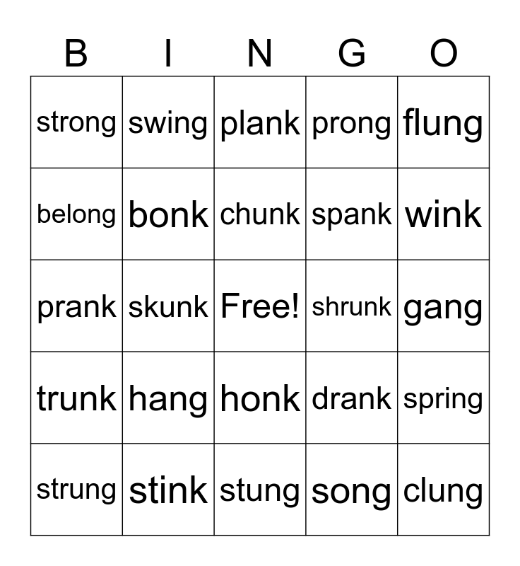 This bingo card has a free space and 24 words: hang, stink, chunk, strung, flung, strong, belong, swing, shrunk, honk, spank, prank, drank, spring, bonk, song, gang, plank, wink, skunk, clung, trunk, prong and stung.