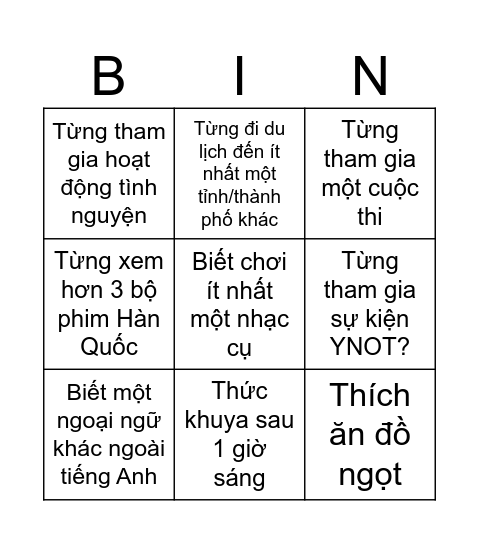 This bingo card has a free space and 8 words: Từng tham gia sự kiện YNOT?, Từng tham gia một cuộc thi, Từng đi du lịch đến ít nhất một tỉnh/thành phố khác, Biết một ngoại ngữ khác ngoài tiếng Anh, Từng tham gia hoạt động tình nguyện, Thích ăn đồ ngọt, Từng xem hơn 3 bộ phim Hàn Quốc and Thức khuya sau 1 giờ sáng.