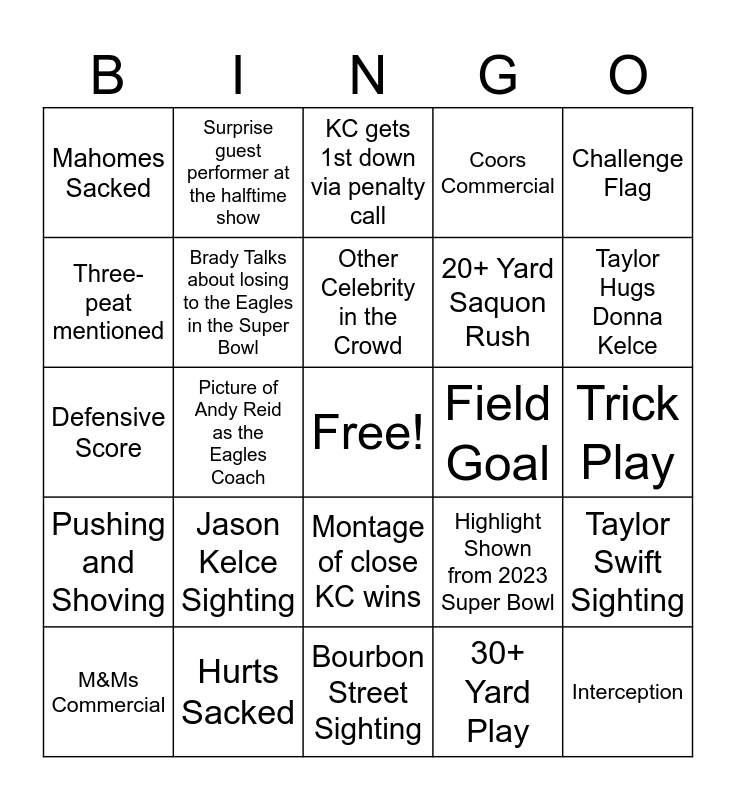 This bingo card has a free space and 29 words: M&Ms Commercial, Tush Push, Picture of Andy Reid as the Eagles Coach, Rushing Touchdown, Mahomes Sacked, KC gets 1st down via penalty call, Brady Talks about losing to the Eagles in the Super Bowl, Jason Kelce Sighting, Field Goal, Hurts Sacked, Trick Play, Interception, Bourbon Street Sighting, 30+ Yard Play, Taylor Hugs Donna Kelce, Fumble! (Turnover), Montage of close KC wins, Pushing and Shoving, Challenge Flag, Defensive Score, Highlight Shown from 2023 Super Bowl, Score inside 2 minutes, 20+ Yard Saquon Rush, Three-peat mentioned, Coors Commercial, Surprise guest performer at the halftime show, Taylor Swift Sighting, Other Celebrity in the Crowd and Mahomes Complains about a non-call.