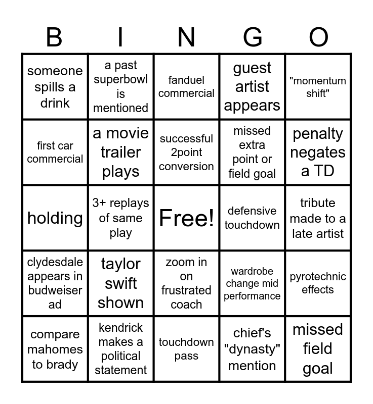 This bingo card has a free space and 48 words: challenge flag thrown, missed field goal, turnover, touchdown pass, taylor swift shown, someone says "GOAT", a past superbowl is mentioned, first beer commercial, first car commercial, a celebrity in a food commercial, a movie trailer plays, guest artist appears, pyrotechnic effects, wardrobe change mid performance, qb sack, pass interference penalty, successful 2point conversion, defensive touchdown, player gets injured and leaves game, "momentum shift", 3+ replays of same play, chief's "dynasty" mention, someone spills a drink, missed extra point or field goal, trick play, penalty negates a TD, compare mahomes to brady, reference to andy reid coaching eagles, zoom in on frustrated coach, clydesdale appears in budweiser ad, "they should have run the ball", paul rudd spotting, "this is a dream come true", sza performs good days, kendrick makes a political statement, new orleans jazz band feature, sza debuts new song, tribute made to a late artist, trump on screen, bradley cooper spotting, referee huddle, tie game after 0-0, fanduel commercial, weather update, holding, chiefs TD, eagles TD and doritos commercial.