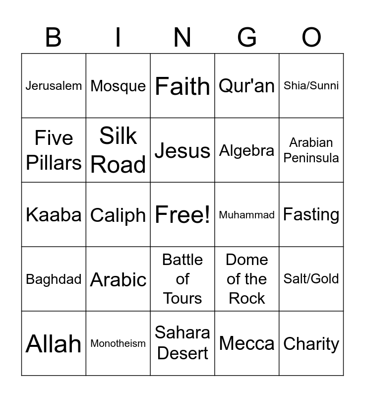 This bingo card has a free space and 24 words: Arabic, Monotheism, Jesus, Allah, Shia/Sunni, Jerusalem, Five Pillars, Mosque, Muhammad, Battle of Tours, Algebra, Kaaba, Dome of the Rock, Salt/Gold, Silk Road, Mecca, Fasting, Faith, Arabian Peninsula, Caliph, Charity, Baghdad, Qur'an and Sahara Desert.