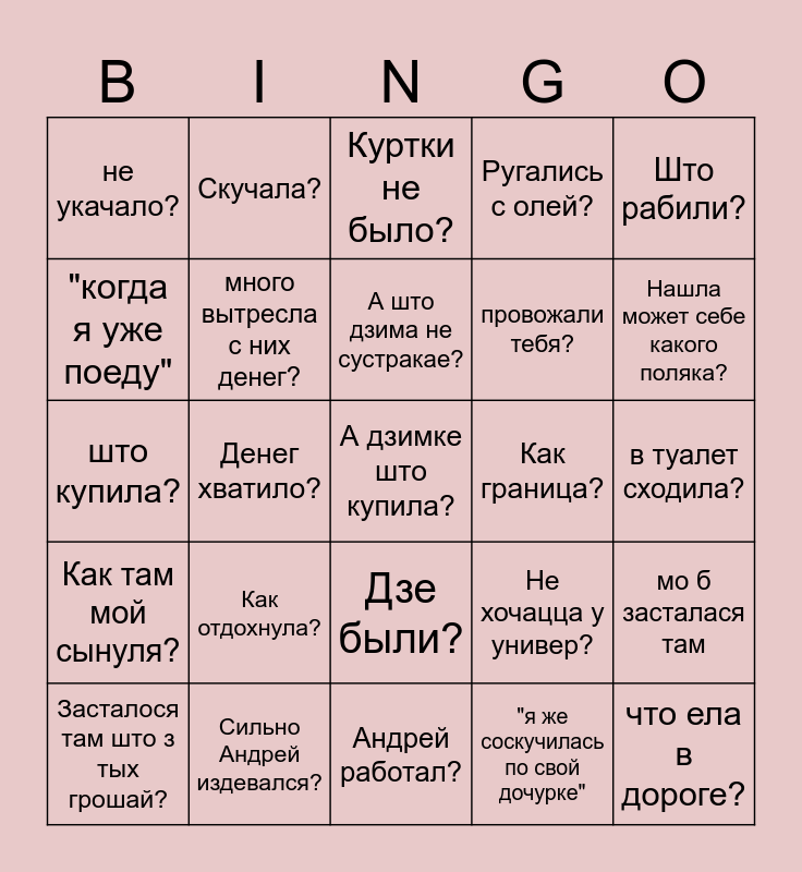 This bingo card has a free space and 24 words: Как отдохнула?, Сильно Андрей издевался?, А што дзима не сустракае?, Засталося там што з тых грошай?, Што рабили?, не укачало?, "когда я уже поеду", Скучала?, Как граница?, Дзе были?, провожали тебя?, што купила?, Не хочацца у универ?, мо б засталася там, много вытресла с них денег?, "я же соскучилась по свой дочурке", в туалет сходила?, Куртки не было?, Нашла может себе какого поляка?, Денег хватило?, что ела в дороге?, Как там мой сынуля?, Ругались с олей? and Андрей работал?.