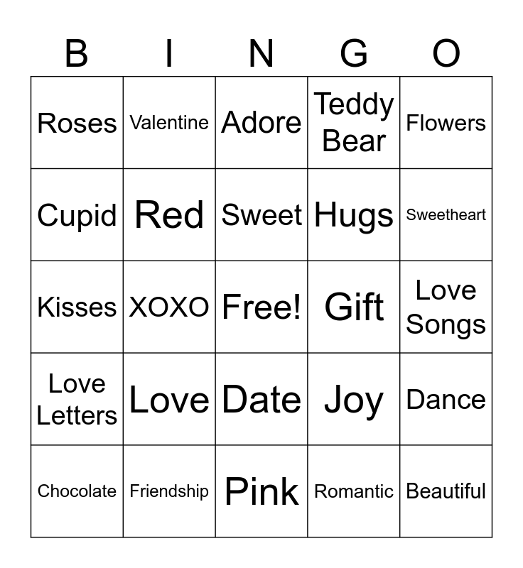 This bingo card has a free space and 24 words: Love, Friendship, Sweet, Chocolate, Flowers, Roses, Cupid, Valentine, Gift, Date, Hugs, Kisses, Joy, Dance, Red, Romantic, Love Songs, Adore, Sweetheart, XOXO, Beautiful, Love Letters, Teddy Bear and Pink.