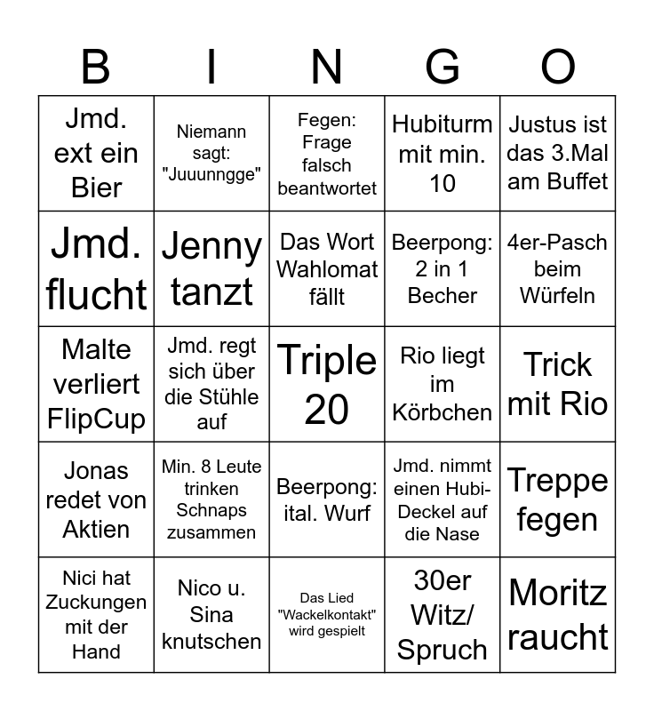 This bingo card has 40 words: Wort Malunt fällt, Malte verliert FlipCup, Bullseye, Jenny tanzt, Nico u. Sina knutschen, Beerpong: ital. Wurf, Das Wort Wahlomat fällt, Runde Schinken-häger, Justus ist das 3.Mal am Buffet, Jonas redet von Aktien, Jmd. regt sich über die Stühle auf, Hubiturm mit min. 10, Triple 20, Trick mit Rio, Rio liegt im Körbchen, Min. 8 Leute trinken Schnaps zusammen, Peruanisches Würfelspiel wird gespielt, Jmd. ext ein Bier, Fegen: Frage richtig beantwortet, Fegen: Frage falsch beantwortet, Treppe fegen, 30er Witz/ Spruch, Beerpong: 2 in 1 Becher, Jmd. flucht, Getränk verschüttet, Wort Skiurlaub fällt, Nils redet über Fußball, Dori wird auf seine Brust angesprochen, Moritz raucht, Menti ist das 10. Mal am vapen, Pascal geht das 3. Mal aufs WC, Nici hat Zuckungen mit der Hand, Kane trifft, Jmd. nimmt einen Hubi-Deckel auf die Nase, 4er-Pasch beim Würfeln, Das Lied "Wackelkontakt" wird gespielt, Das Lied: Unwritten läuft, Joker, Niemann sagt: "Juuunngge" and Janice trinkt Lillet.