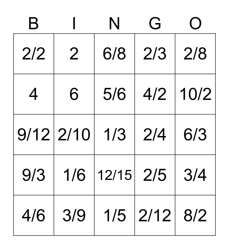 This bingo card has 51 words: 1/2, 1/3, 1/4, 1/5, 1/6, 1, 2, 3, 4, 5, 6, 2/3, 3/4, 2/5, 3/5, 4/5, 5/6, 2/4, 2/6, 2/8, 2/10, 2/12, 2/2, 4/2, 6/2, 8/2, 10/2, 12/2, 4/6, 6/8, 4/10, 6/10, 8/10, 10/12, 3/6, 3/9, 3/12, 3/15, 3/18, 3/3, 6/3, 9/3, 12/3, 15/3, 18/3, 6/9, 9/12, 6/15, 9/15, 12/15 and 15/18.