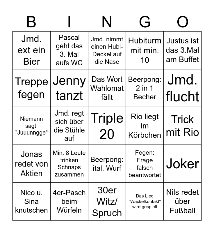 This bingo card has 39 words: Wort Malunt fällt, Malte verliert FlipCup, Bullseye, Jenny tanzt, Nico u. Sina knutschen, Beerpong: ital. Wurf, Das Wort Wahlomat fällt, Runde Schinken-häger, Justus ist das 3.Mal am Buffet, Jonas redet von Aktien, Jmd. regt sich über die Stühle auf, Hubiturm mit min. 10, Triple 20, Trick mit Rio, Rio liegt im Körbchen, Min. 8 Leute trinken Schnaps zusammen, Peruanisches Würfelspiel wird gespielt, Jmd. ext ein Bier, Fegen: Frage richtig beantwortet, Fegen: Frage falsch beantwortet, Treppe fegen, 30er Witz/ Spruch, Beerpong: 2 in 1 Becher, Jmd. flucht, Getränk verschüttet, Wort Skiurlaub fällt, Nils redet über Fußball, Moritz raucht, Menti ist das 10. Mal am vapen, Pascal geht das 3. Mal aufs WC, Falafel ist leer, Kane trifft, Jmd. nimmt einen Hubi-Deckel auf die Nase, 4er-Pasch beim Würfeln, Das Lied "Wackelkontakt" wird gespielt, Das Lied: Unwritten läuft, Joker, Niemann sagt: "Juuunngge" and Janice trinkt Lillet.