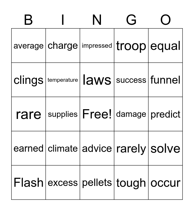 This bingo card has a free space and 29 words: Flash, advantages, supplies, gusts, average, impressed, temperature, climate, damage, excess, predict, occur, pellets, tough, funnel, politics, advice, earned, equal, rare, rarely, honored, success, clings, troop, charge, solve, laws and capital.