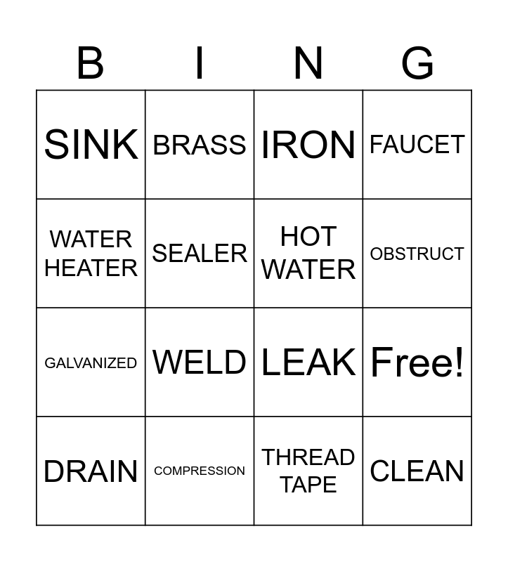 This bingo card has 20 words: Free!, COPPER, IRON, PIPE, DRAIN, WATER HEATER, COMPRESSION, SINK, GALVANIZED, BRASS, WELD, LEAK, SEALER, CLEAN, HOT WATER, SERVICE, OBSTRUCT, FAUCET, THREAD TAPE and DRAIN SNAKE.