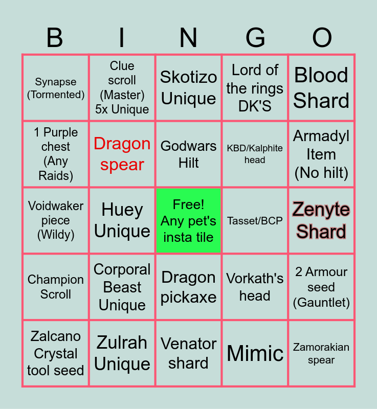 This bingo card has a free space and 24 words: Corporal Beast Unique, Zulrah Unique, Godwars Hilt, Zalcano Crystal tool seed, Blood Shard, Synapse (Tormented), 1 Purple chest (Any Raids), Clue scroll (Master) 5x Unique, Tasset/BCP, Dragon pickaxe, KBD/Kalphite head, Voidwaker piece (Wildy), Vorkath's head, 2 Armour seed (Gauntlet), Dragon spear, Mimic, Zenyte Shard, Skotizo Unique, Armadyl Item (No hilt), Huey Unique, Zamorakian spear, Champion Scroll, Lord of the rings DK'S and Venator shard.