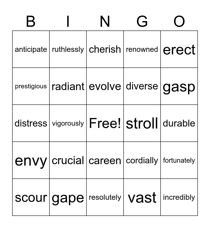 This bingo card has a free space and 52 words: colossal, incredibly, extract, resolutely, crucial, fashion, ruthlessly, penetrate, prestigious, cunningly, radiant, towering, fortunately, cordially, stunning, prudently, evolve, stroll, divulge, erect, vigorously, vast, anticipate, diverse, intrigued, extol, devastating, despair, gasp, plead, content, renowned, bellow, anoint, impressive, cherish, gape, adept, ecstatic, momentous, petrified, durable, envy, emerge, careen, confidently, adorn, distress, retrieve, sinister, scour and tentative.