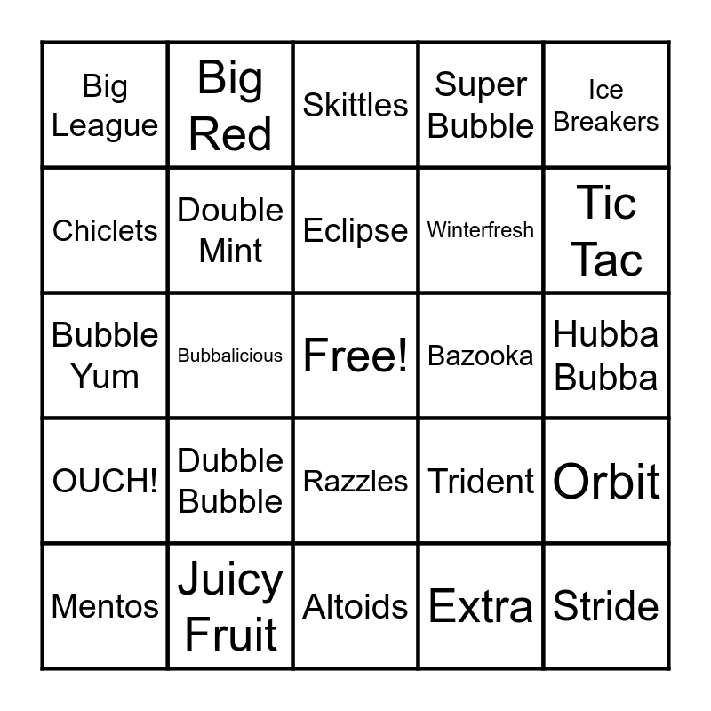 This bingo card has a free space and 24 words: Dubble Bubble, Juicy Fruit, Eclipse, Mentos, Ice Breakers, Big League, Chiclets, Big Red, Bazooka, Razzles, Winterfresh, Bubble Yum, Trident, Orbit, Double Mint, Extra, Hubba Bubba, Skittles, Tic Tac, Bubbalicious, Stride, OUCH!, Super Bubble and Altoids.
