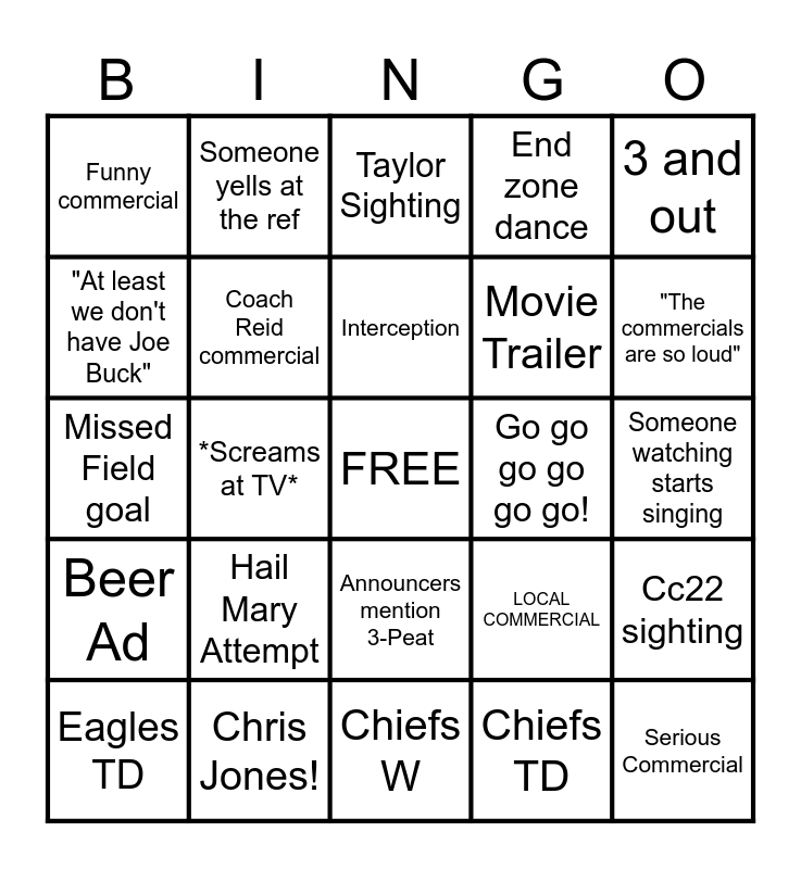 This bingo card has a free space and 24 words: Hail Mary Attempt, Chris Jones!, Interception, Eagles TD, 3 and out, Funny commercial, "At least we don't have Joe Buck", Someone yells at the ref, Go go go go go go!, Announcers mention 3-Peat, Movie Trailer, Missed Field goal, LOCAL COMMERCIAL, Cc22 sighting, Coach Reid commercial, Chiefs TD, Someone watching starts singing, Taylor Sighting, "The commercials are so loud", *Screams at TV*, Serious Commercial, Beer Ad, End zone dance and Chiefs W.